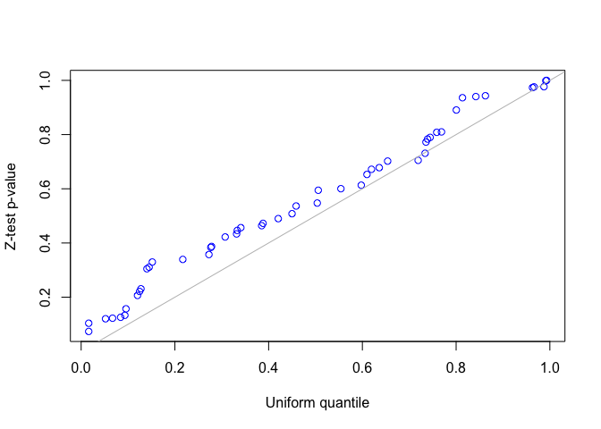 qqplot(runif(length(p)), p, xlab = "Uniform quantile", ylab = "Z-test p-value", col = "blue")