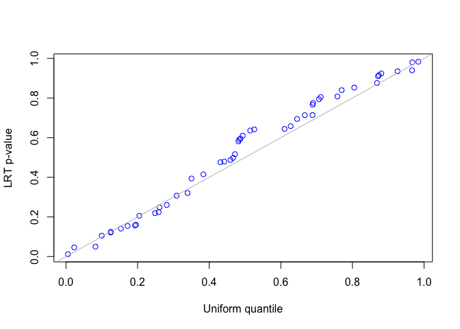 qqplot(runif(length(pLRT)), pLRT, xlab = "Uniform quantile", ylab = "LRT p-value", col = "blue")