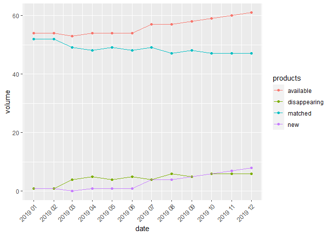 The second one, dataMATCH, can be used to demonstrate the data_matching function and it will be described in the next part of the guidelines. Generally, this artificial data set contains the following columns: time - dates of transactions (Year-Month-Day); prices - prices of sold products; quantities - quantities of sold products; codeIN - internal product codes from the retailer; codeOUT - external product codes, e.g. GTIN or SKU in the real case; description - descriptions of sold products, eg. ‘product A’, ‘product B’, etc.