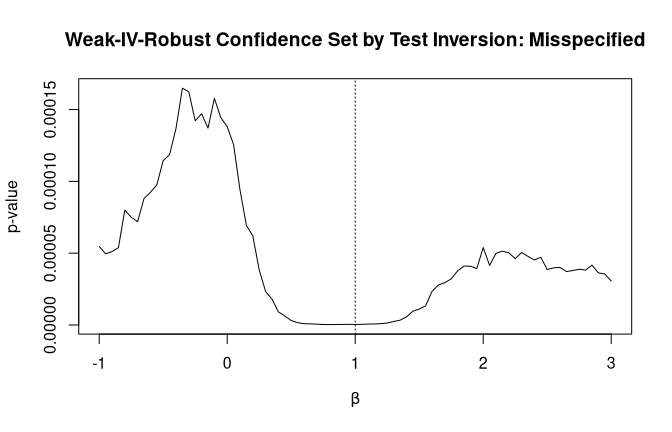 main = "Weak-IV-Robust Confidence Set by Test Inversion: Misspecified")
