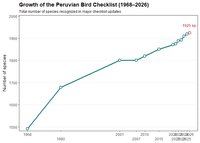 The chart shows the steady increase in the number of bird species recorded in Peru from 1968 to 2026, reflecting continuous research and improvements in taxonomic resolution: