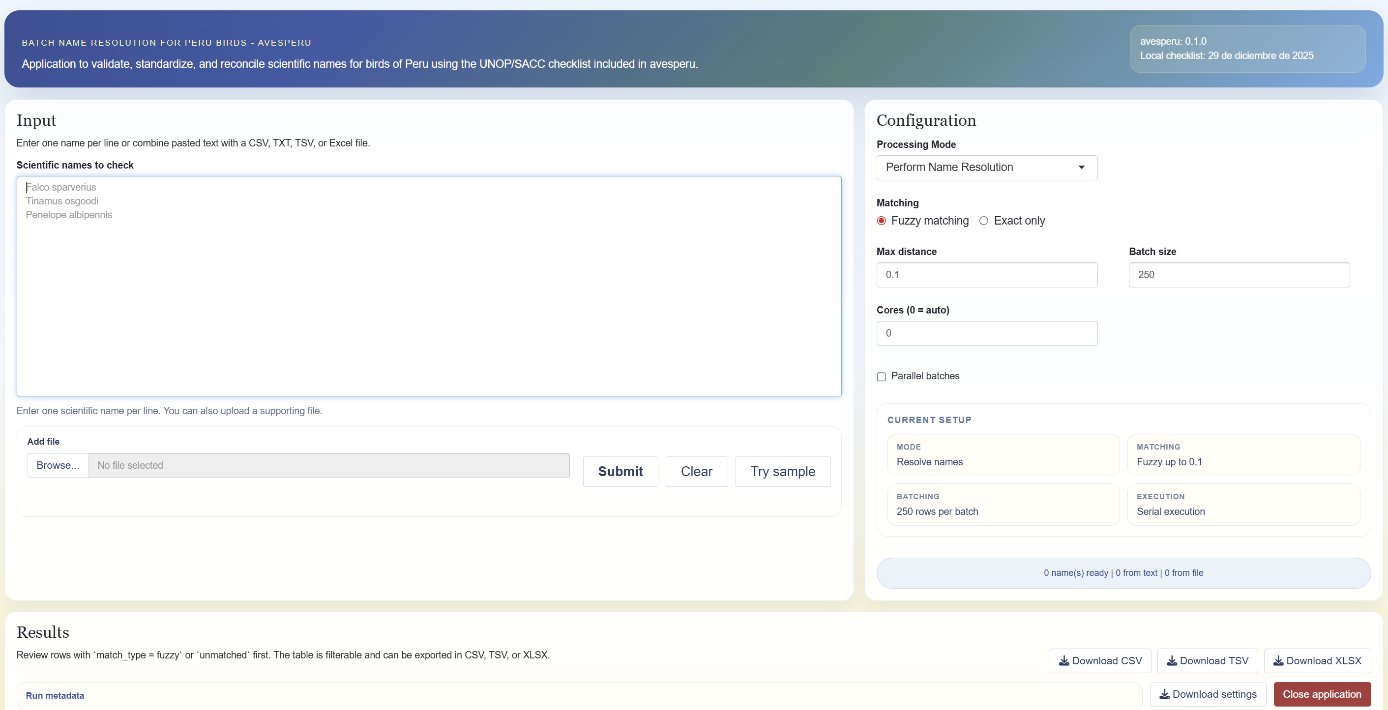 data("aves_peru_2026_v1")The package includes an interactive Shiny application for batch