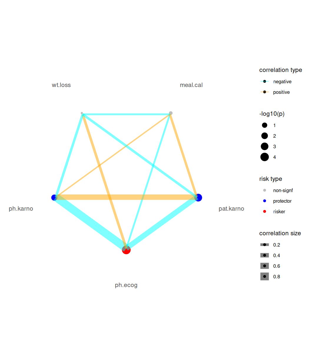 For Cox-PH modeling results (focal variables must be continuous type), we provide a risk network plotting function.