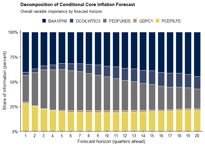 The results indicate that the importance of the credit spread increases steadily with the forecast horizon. This pattern suggests that financial conditions—particularly corporate credit risk—play an increasingly prominent role in shaping medium-term inflation dynamics. This finding is consistent with evidence that credit spreads contain predictive information for demand-side pressures (e.g., Lopez-Salido et al., 2017; Caldara and Herbst, 2019).