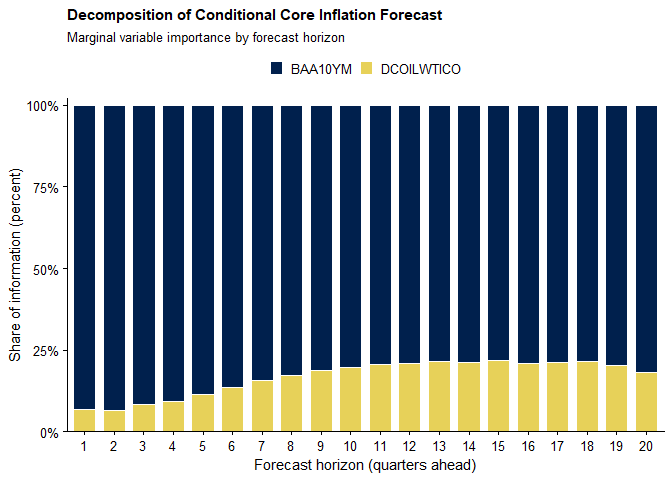 Marginal variable importance isolates the contribution of the imposed future constraints. The decomposition is dominated by the corporate credit spread, while oil prices gain importance gradually at longer horizons due to their indirect and lagged transmission to core inflation.