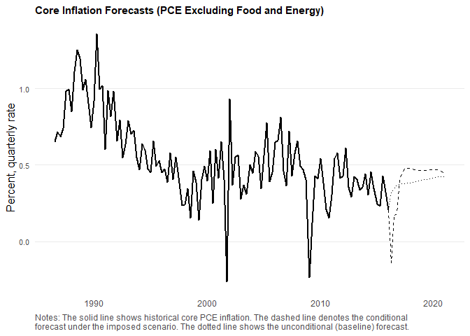 caption = "Notes: The solid line shows historical core PCE inflation. The dashed line denotes the conditional \nforecast under the imposed scenario. The dotted line shows the unconditional (baseline) forecast."