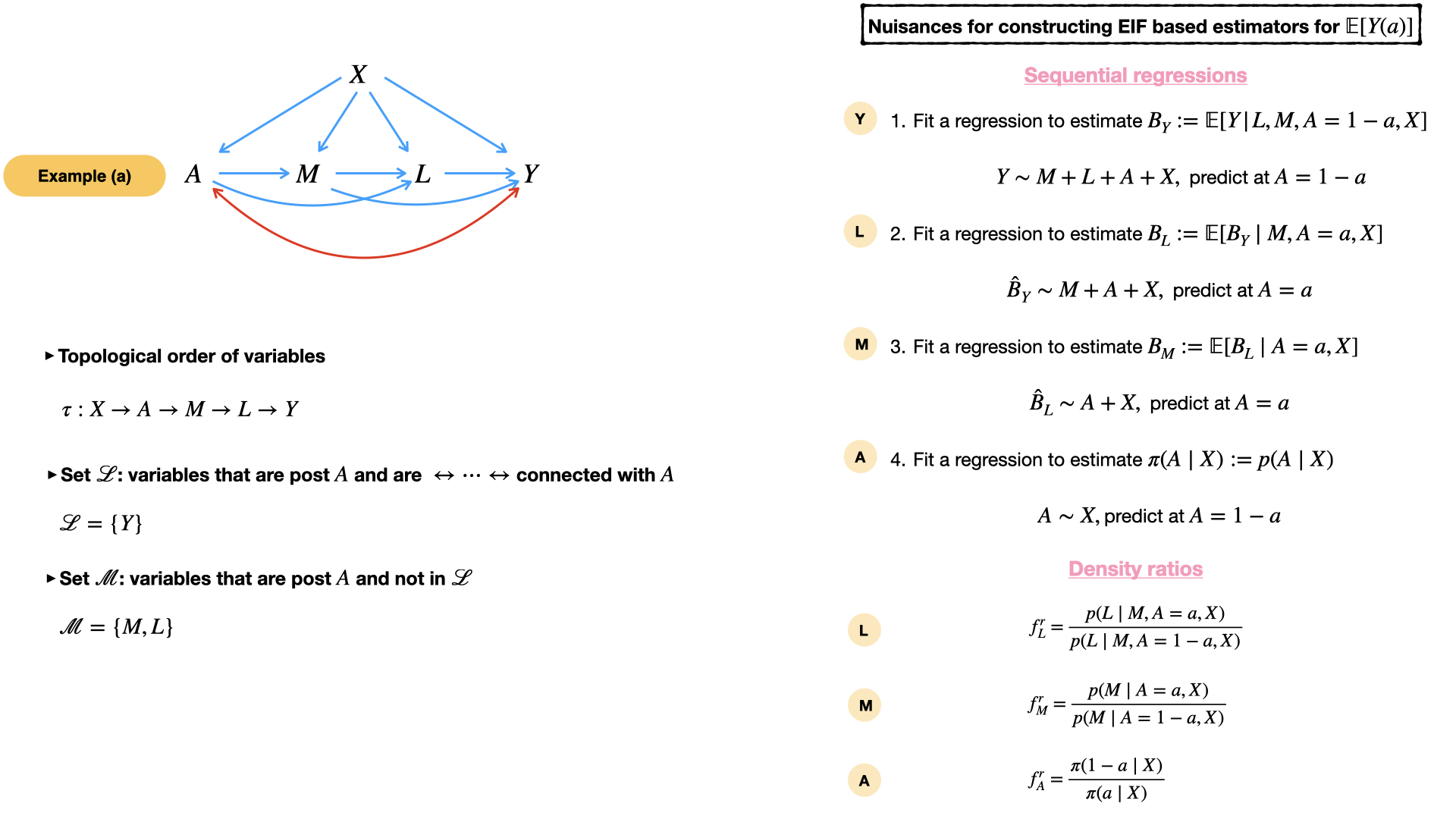 di_edges=list(c('X','A'), c('X','M'), c('X','L'),c('X','Y'), c('M','Y'), c('A','M'), c('A','L'), c('M','L'), c('L','Y')), # specify the directed edges, with each pair of variables indicating an directed edge from the first variable to the second. For example, c('X', 'A') represents a directed edge from X to A.
