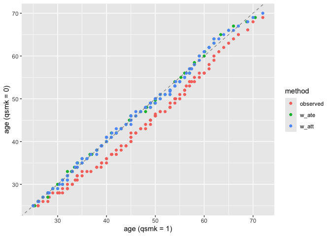 plot_qq(nhefs_weights, age, qsmk, .weights = c(w_ate, w_att))