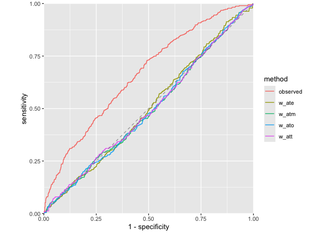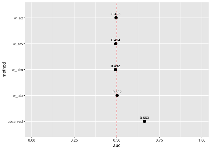 Assess how well your propensity score model discriminates between treatment groups, as well as whether or not the weights create an AUC of about 0.5 (what you would observe from a randomized experiment):