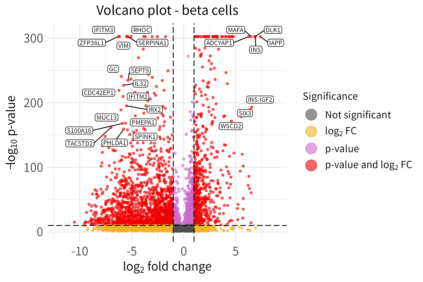 The default option is preferred in the example below. To emphasize the usage of different thresholds for labeling and significance, the thresholds for labeling are set much higher than the thresholds for significance.