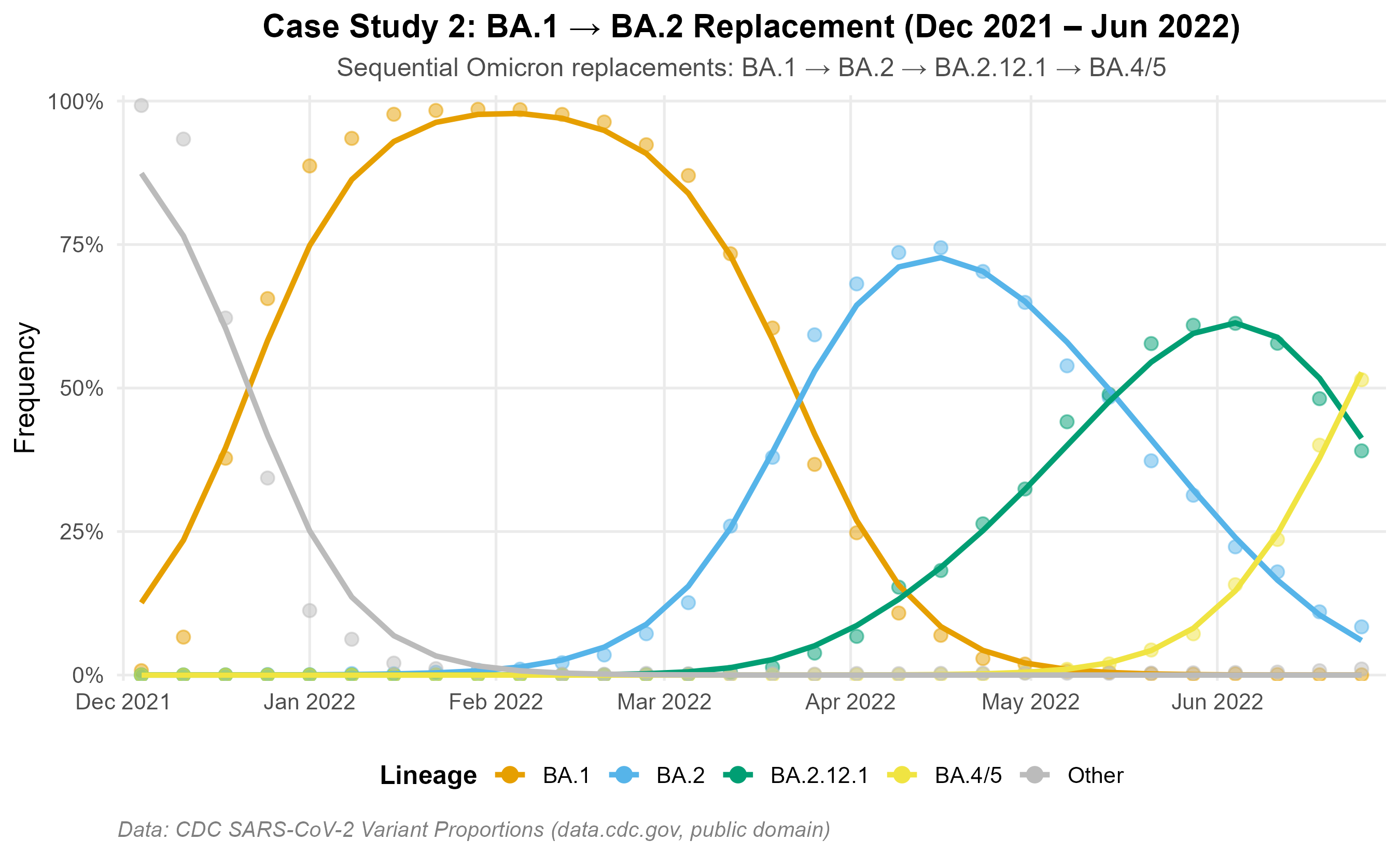 BA.1 → BA.2 period (Dec 2021 – Jun 2022): A well-characterized Omicron replacement wave with four sequential subvariant sweeps.
