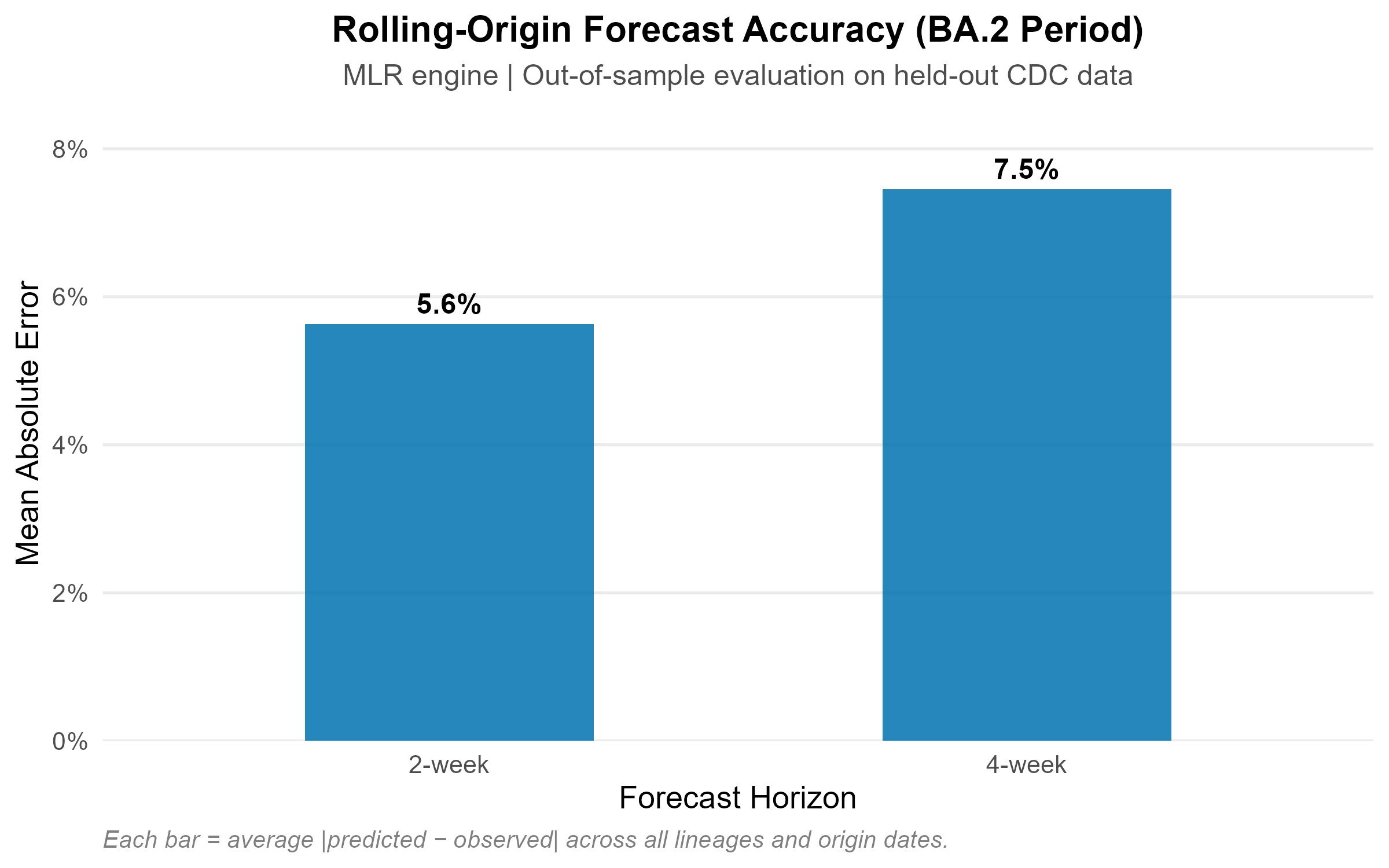 Rolling-origin out-of-sample evaluation on the BA.2 period: approximately 4% MAE at 2-week and 8% at 4-week horizon.