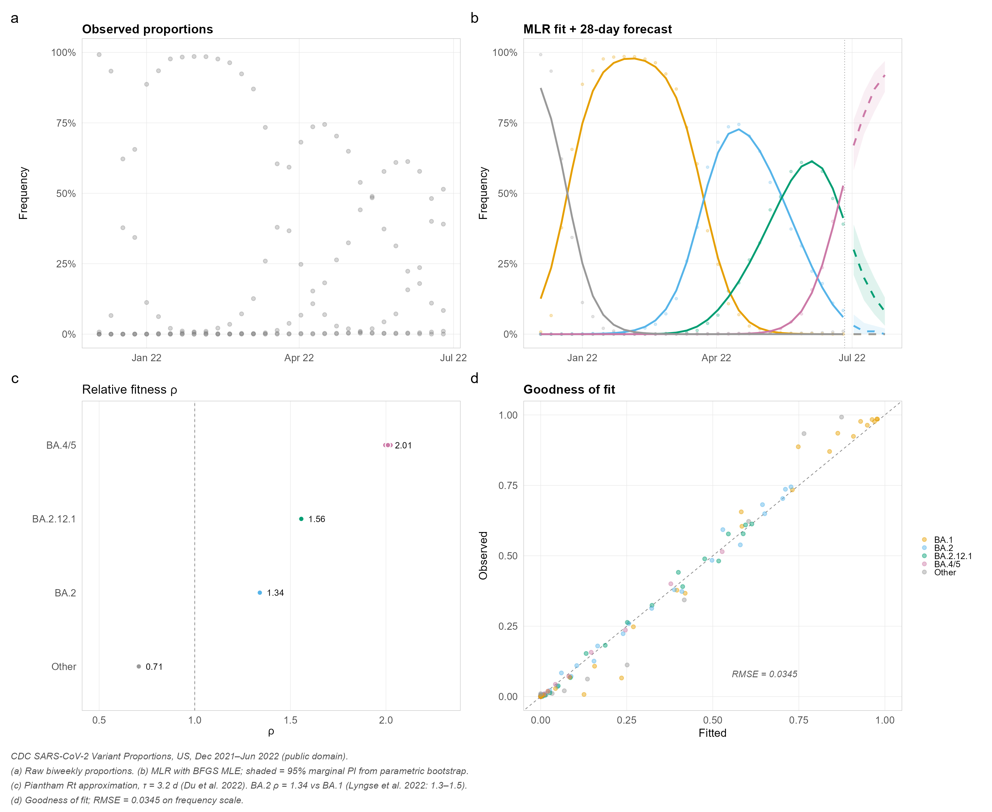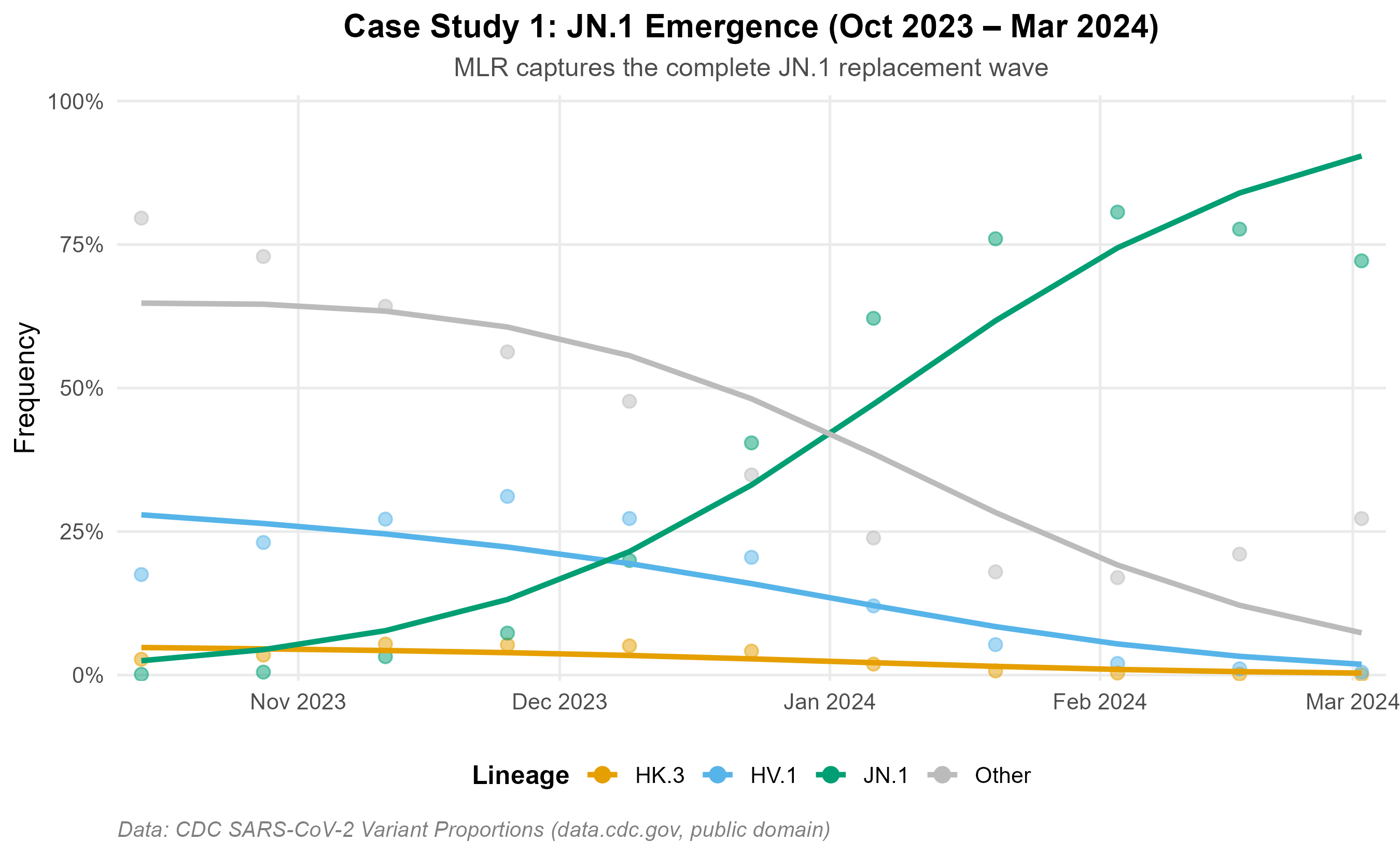 JN.1 emergence (Oct 2023 – Mar 2024): MLR recovers the observed replacement trajectory from <1% to >80%.