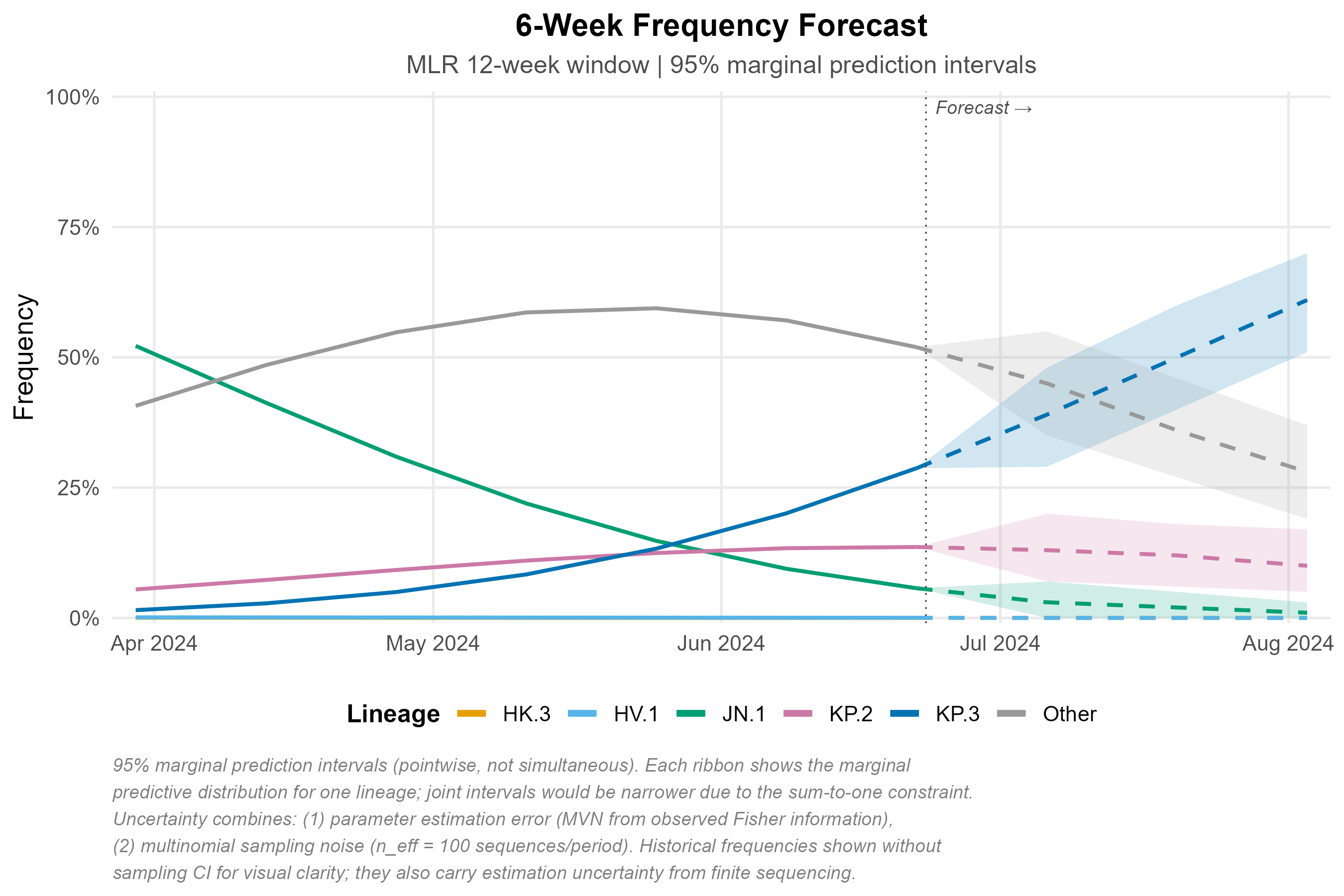 Six-week projection with 95% marginal prediction intervals (pointwise, not simultaneous). Uncertainty reflects parameter estimation error (MVN from Fisher information) and multinomial sampling noise (n_eff = 100 sequences/period). See figure caption for full methodological notes.