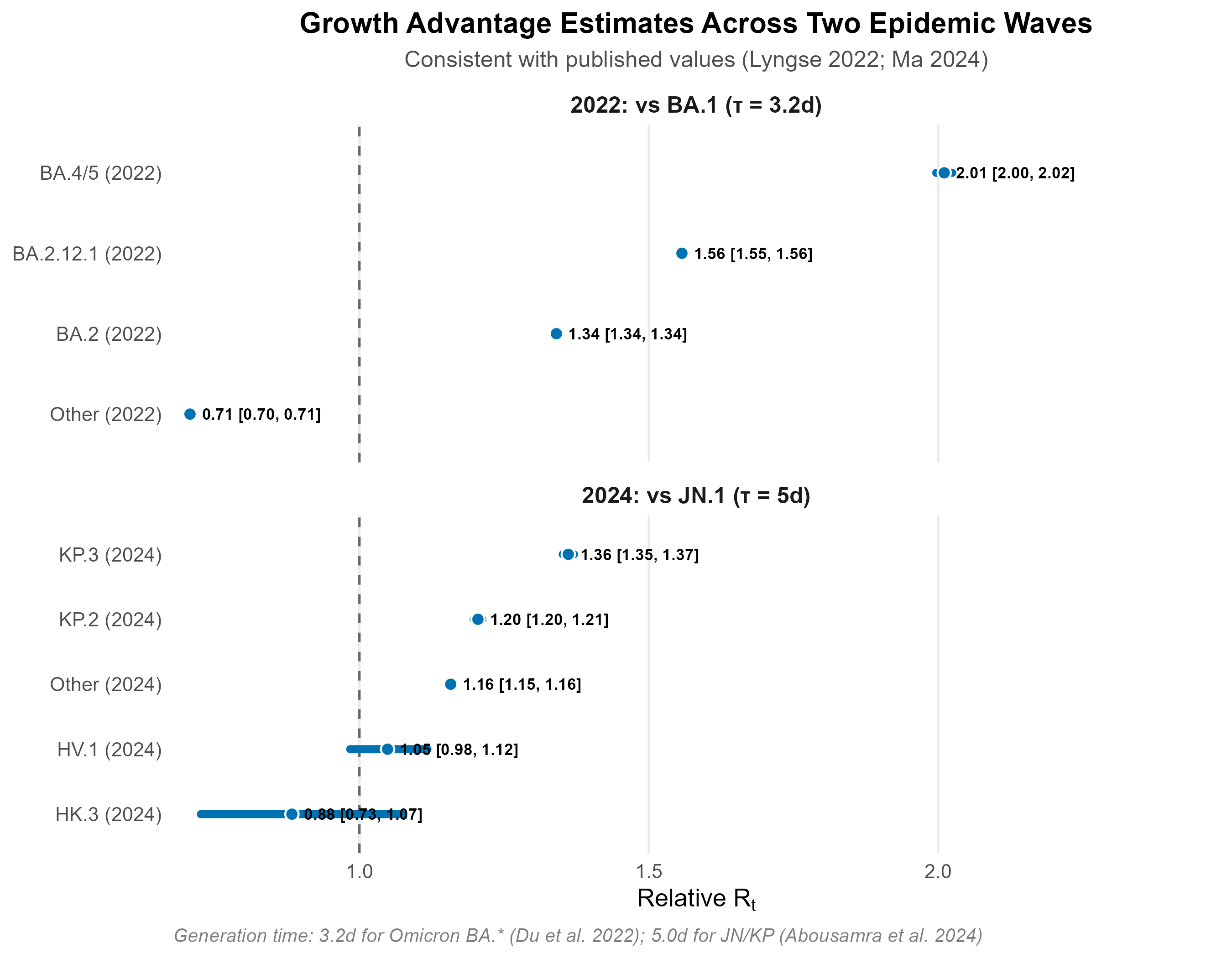 Relative Rt estimates are consistent with published values: BA.2 = 1.34× vs BA.1 (Lyngse et al. 2022, published 1.3–1.5×); KP.3 = 1.36× vs JN.1. Generation times: 3.2 days for Omicron BA.* subvariants (Du et al. 2022); 5.0 days for JN/KP lineages.