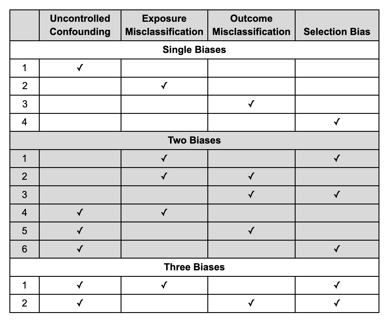different combinations of bias as identified by the same prefixing