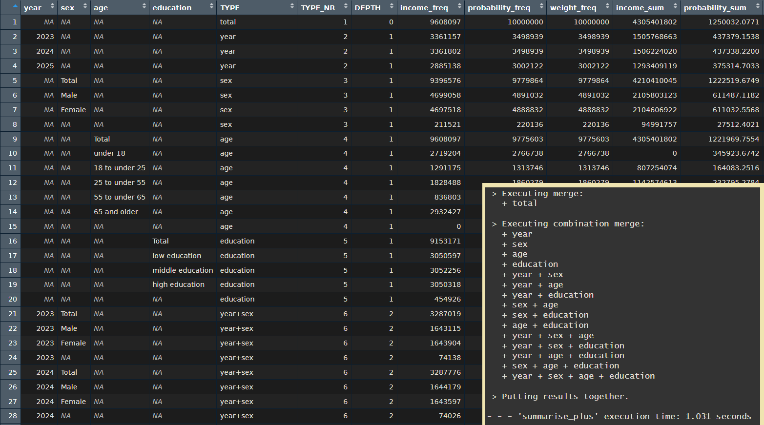 summary_df summarise_plus(class = c(year, sex, age, education),