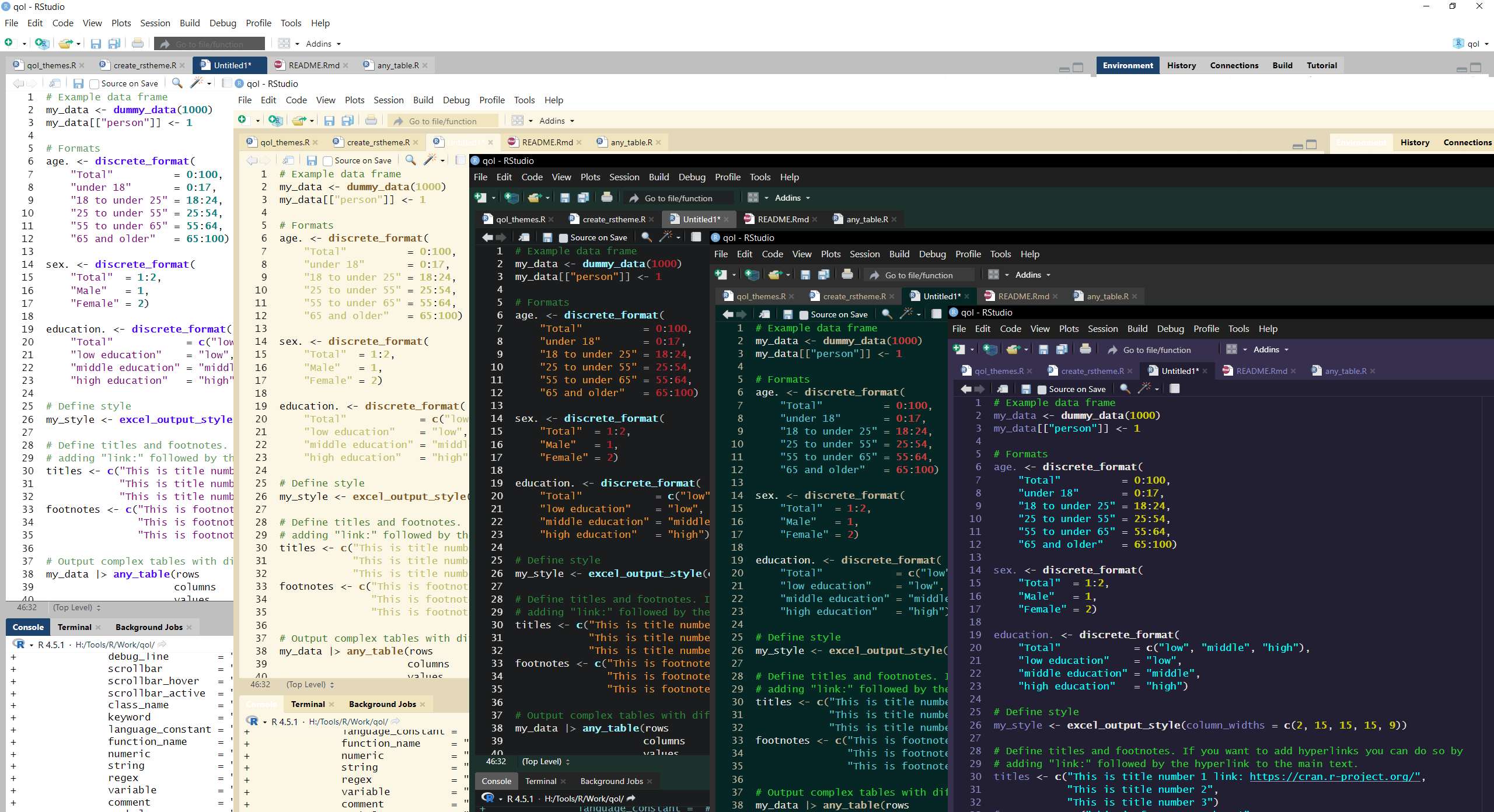 Don’t like the colors of the built-in in RStudio themes? Can’t find a theme online that fits your liking? No Problem. With a simple function you can create a full theme file and decide which parts of the editor receive which colors. The themes shown below and the corresponding code can be found on GitHub.
