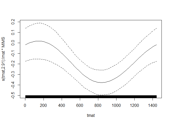 fit_freq2 = gam(y ~ s(tmat, by=lmat*wmat, bs="cc", k=10)+X1, data=data.SoFR, family="binomial", method = "REML")