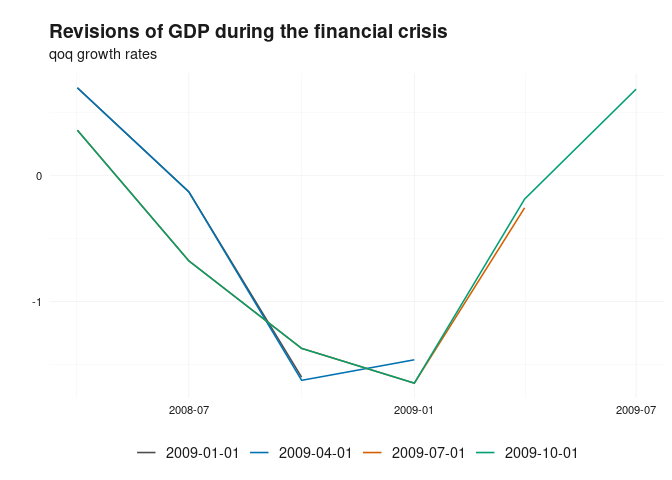 remotes::install_github("ropensci/reviser")The following example analyzes GDP data revisions for the United States by transforming the data into a format suitable for vintage analysis, visualizing revisions during the financial crisis, and assessing how early estimates compare to the final release. It then identifies the point at which the estimates become stable and reliable.