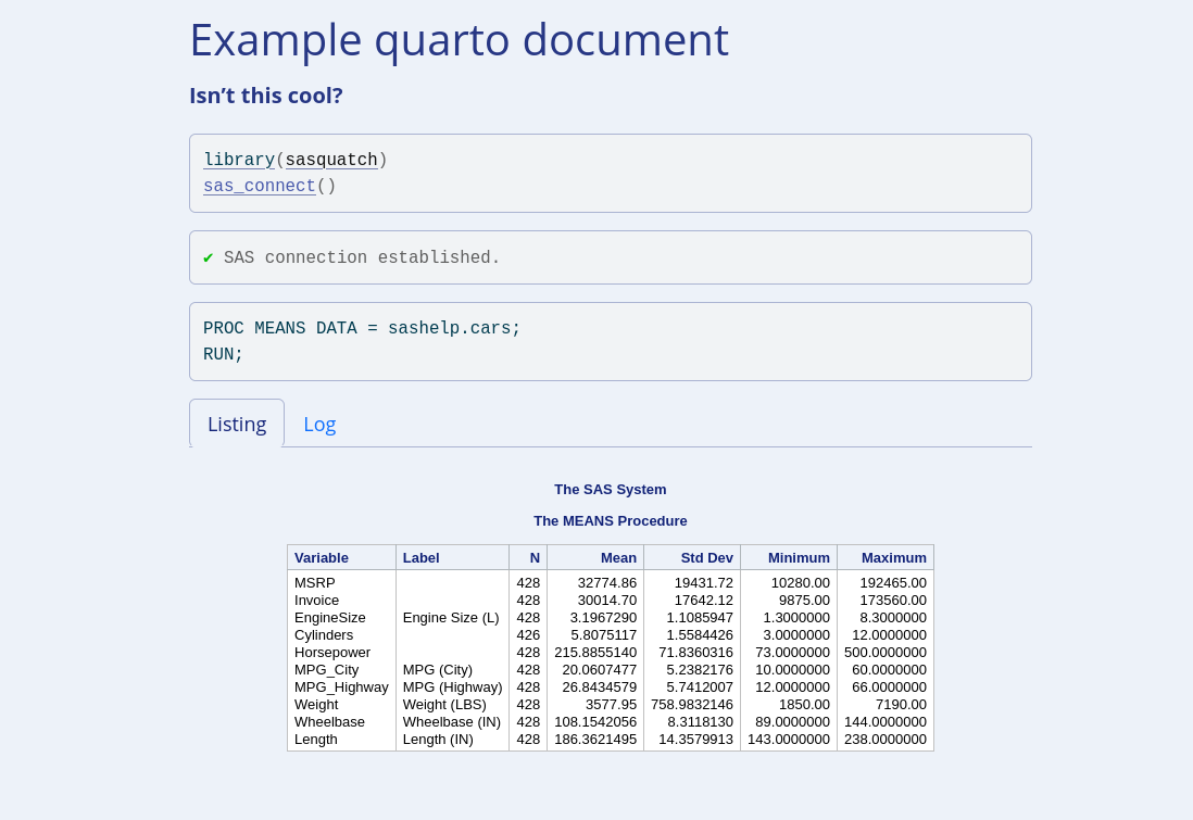 sas_cars <- sas_to_r("cars", libref = "sashelp")And of course, render beautiful HTML or latex quarto/rmarkdown
