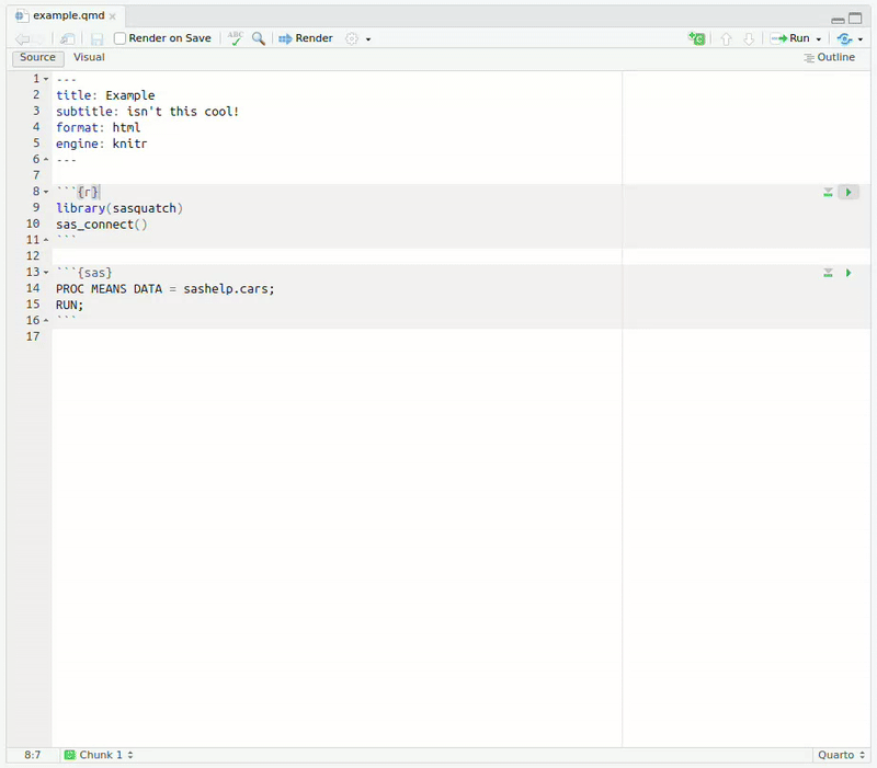 ```Now, you should be able to run SAS code blocks in RStudio like any other.
