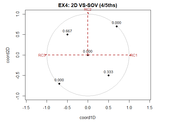 vs_sov_user()Examples 2-4 expand the space to two dimensions (2D) using 5 voters and 3 roll calls. They illustrate the use of simple versus absolute majority rule (EX2 and EX4), the use of midpoints in place of normal vectors (EX2 and EX3), and a supermajority rule (EX4).
