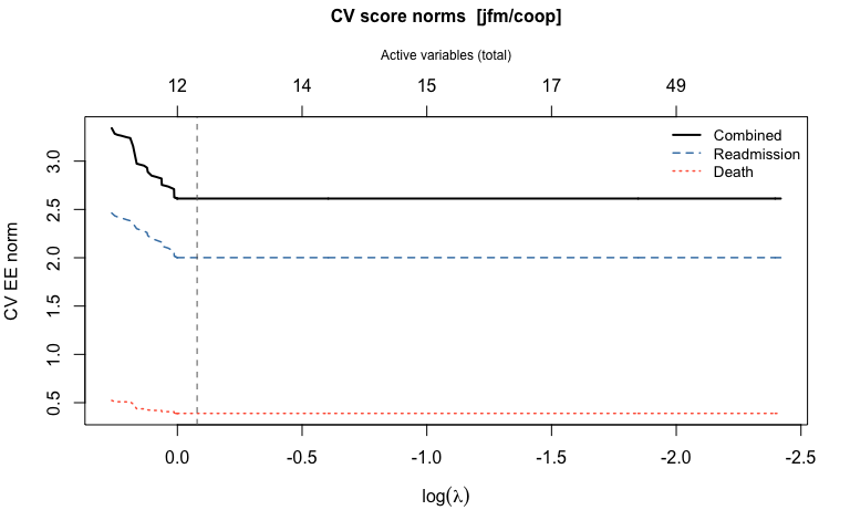 #> Readmission (alpha): 1, 2, 3, 4, 5, 7, 9, 10, 12, 14, 15, 17, 23, 33, 35, 37, 38, 39, 41, 43, 47, 49, 52, 55, 57, 60, 62, 64, 66, 67, 69, 71, 73, 74, 77, 79, 80, 82, 92, 93, 95, 96, 97, 98