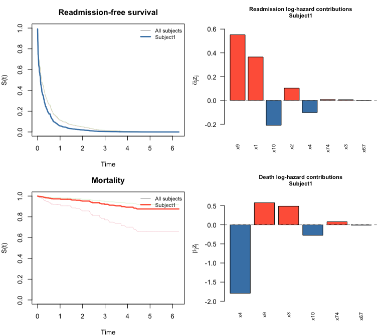 # Markers expanded to row level: alpha^T z for readmission, beta^T z for death