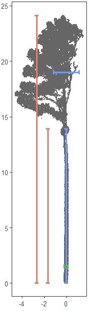 basics_diagnostic_plot(las, height=24.1, cbh=13.9, crown_width=2.29, dbh=0.329, res = 0.1)