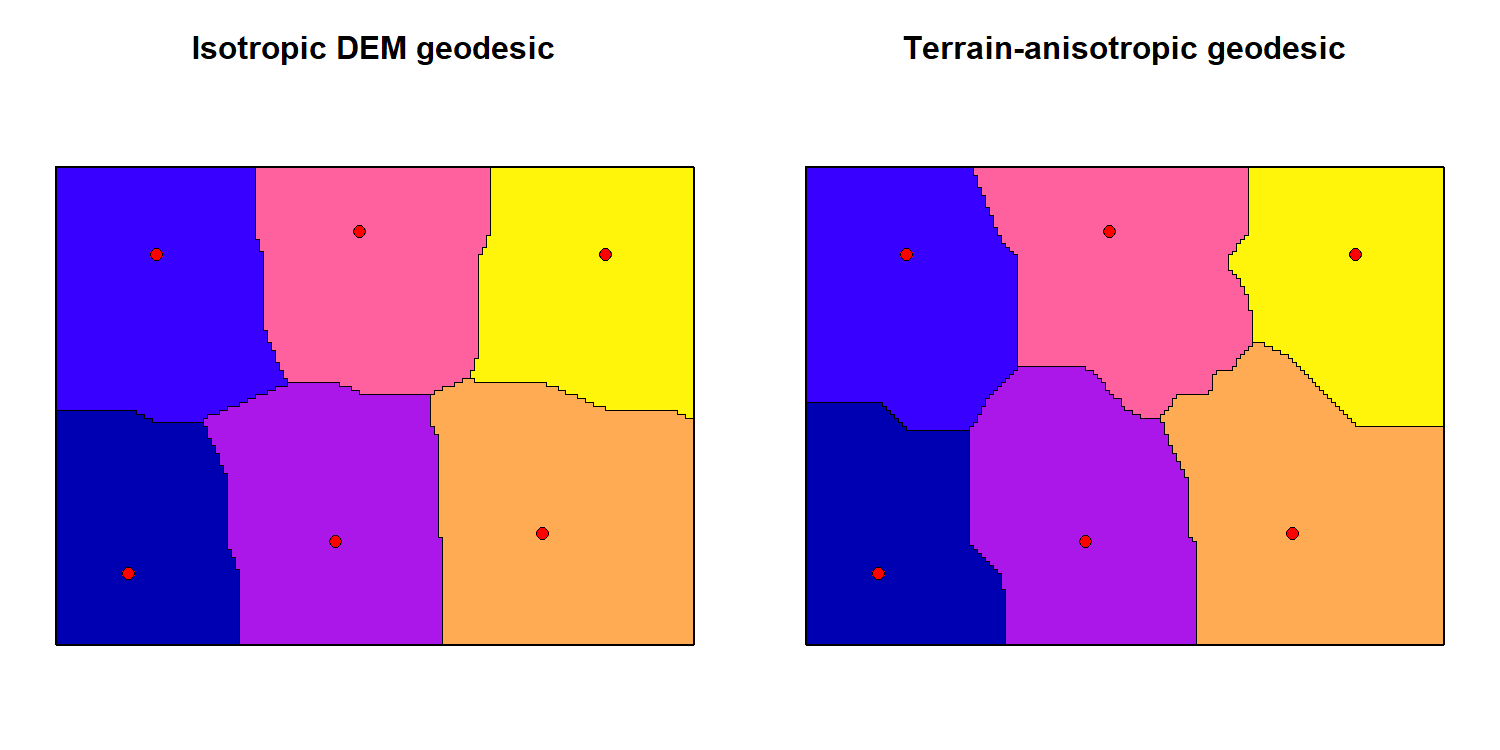 The example below shows how terrain anisotropy (direction-dependent movement cost) can substantially alter geodesic tessellations compared to isotropic resistance.