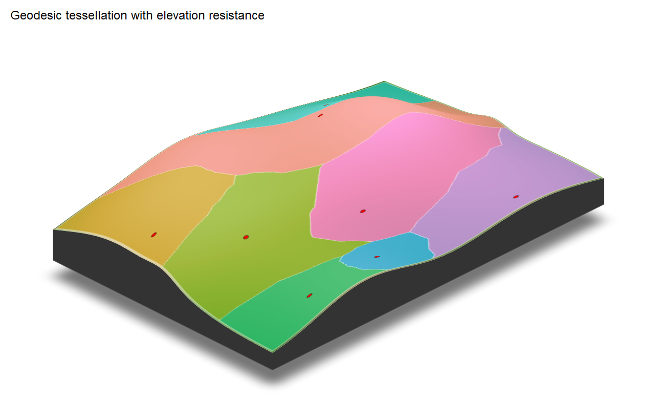 Unlike isotropic resistance, terrain-anisotropic geodesic tessellations allow uphill and downhill movement to differ, producing direction-dependent allocation patterns.
